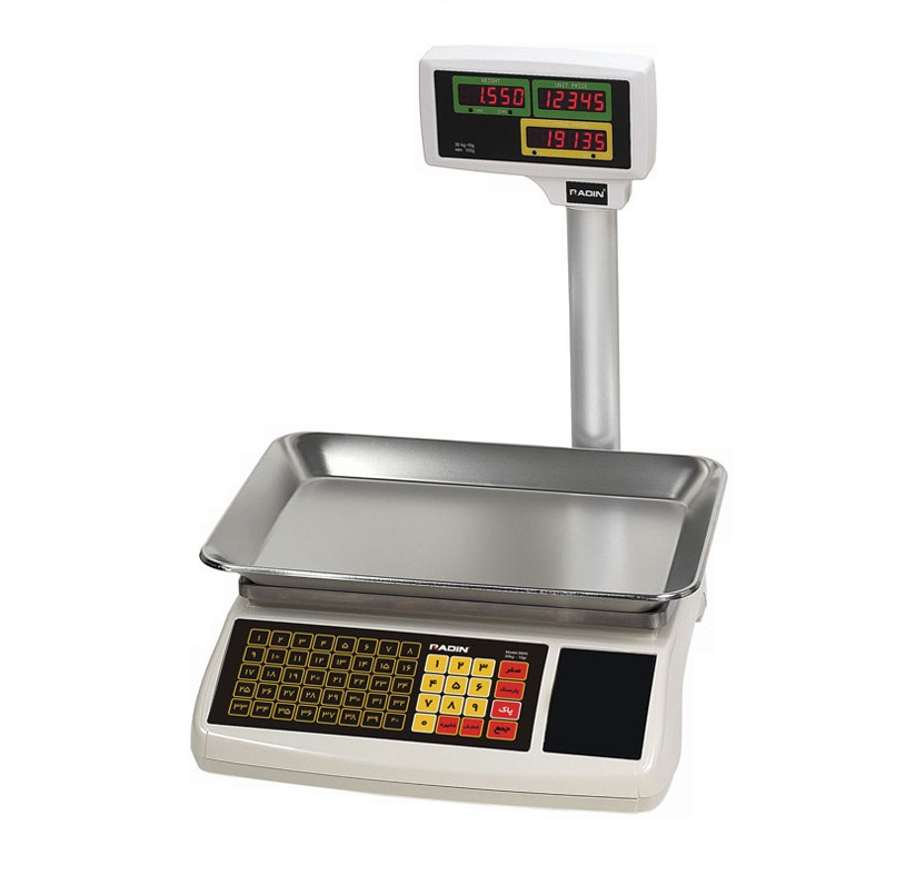 ترازوی علمک دار رادین مدل 5600 نمونه ای دیگر از ترازوهای ساده فروشگاهی است که رادین با تغییر قابلیت ها و توانایی ها، و برای کاهش قیمت محصول و امکان تهیه آن برای اقشار بیشتر عرضه کرده است. ترازوی علمک دار رادین مدل 5600 فاقد چاپگر است. طراحی جسورانه ای دارد که ترازو را دارای شخصیت نشان می دهد. صفحه کلید، کلیدهای بیشتری در قیاس با دیگر مدل های ساده دارد. این ترازوی فروشگاهی علمک دارد و روی علمک نمایشگرهای سه تکه LED تعبیه شده اند. سینی مانند دیگر ترازوهای ساده فروشگاهی رادین لبه دار است. و البته بدیهی است که از استیل باشد. 40 دکمه روی صفحه کلید نشان دهنده تعداد حافظه های این ترازوی ساده است. عددی که به خوبی می تواند اقلام پرفروش یک سوپرمارکت یا بقالی را ثبت کند تا فراخواندن اطلاعاتی مانند قیمت کالا، در اسرع وقت انجام بگیرد. ترازو فروشگاهی رادین مدل 5600 می تواند تا 40 کیلوگرم را وزن کند و این مقدار را با حساسیت 1گرم انجام می دهد. این ترازو می تواند فروش را به دو صورت وزنی و عددی انجام دهد. فروش عددی اصطلاحی است که به منظور فروش اقلامی مانند مربا و کنسرو به کار برده می شود و نیاز به وزن کردن ندارد. در این حالت فروشنده با وارد کردن کد مخصوص کالا می تواند قیمتش را روی نمایشگر ظاهر کند تا مشتری مطلع شود. چنانچه شمار این اقلام بیشتر از یک عدد باشد نیز، با وارد کردن کد کالا، ترازو قادر به جمع بستن قیمت آنها خواهد بود. می توان برای برقراری امنیت بیشتر به صورت زمانی، ترازوی فروشگاهی 5600 را قفل کرد. با داشتن باتری قابل شارژ داخلی هم می توان در مواقع نبود برق شهری که منبع اصلی تامین انرژی ترازو به حساب می آید، از ترازو استفاده کرد. ترازوی ساده فروشگاهی رادین مدل 5600 علیرغم کمبودهایی که در قابلیت ها دارد، ترازویی مناسب و دقیق است که برای نیازهای ابتدایی فروشگاهی و برای اقشار کم استطاعت تر تولید شده است.