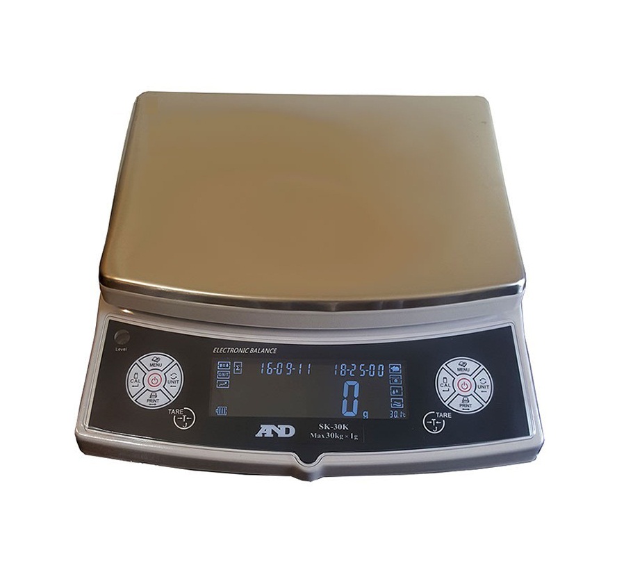ترازوی 1 گرمی AND مدل SK30K بیش از آنکه ترازویی آزمایشگاهی جلوه کند، به ترازوهای صنعتی شباهت دارد. با این وجود حساسیت و دقت ترازوی SK30K بیان کننده چیز دیگری است. 1 گرم حساسیت در برابر ظرفیت توزین 30 کیلوگرمی این ترازو دیجیتال می تواند توجه حوزه گسترده ای از مشاغل و اصناف را جلب کند. چه آزمایشگاه باشد چه فروشگاه پیچ و مهره و چه عطاری. ترازوی 1 گرمی AND مدل SK30K از طراحی ساده ای بهره می برد و کاربری ساده ای نیز دارد. ضمنا باید اشاره کرد که این ترازو از جمله ترازوهای طرح AND به حساب می آید و کشور سازنده آن چین است. نمایشگری از نوع LED با نور آبی برای این ترازوی گرمی تعبیه شده است که از شفافیت لازم برخوردار است. سینی از استیل ساخته شده است و 22×29 سانتیمتر نیز اندازه دارد که فضای کافی را برای مصارف مرتبط و معقول فراهم می کند. کالیبراسیون در ترازوی دیجیتال و گرمی AND مدل SK30K خارجی است و بایستی به صورت دستی و با کمک سنگ کالیبره مخصوص انجام شود. متاسفانه ارتباط با کامپیوتر یا چاپگر جانبی وجود ندارد و از این حیث برای ترازو آزمایشگاهی 1 گرمی AND مدل SK30K ضعف شمرده می شود. اما قابلیت زیرکشی فراهم است و می توان از این امکان که در آزمایشگاه ها کاربرد فراوانی دارد و از زیر ترازو برای وزن کردن استفاده می شود، استفاده کرد. SK30K می تواند در چندین واحد وزنی توزین را انجام دهد. این مزیت در آزمایشگاه ها بیشتر از دیگر مشاغل اهمیت دارد. شمارش قطعه آخرین ویژگی قابل ذکر ترازوی AND است. انرژی این دستگاه گرمی و دقیق از طریق برق شهری تامین می شود و فقدان وجود باطری قابل شارژ داخلی را نیز باید به معایبش افزود. در درون بسته بندی محصول یک آداپتور برای اتصال با برق، دفترچه راهنما و یک قلاب زیرکش برای استفاده از زیر ترازو برای توزین قرار داده شده است.