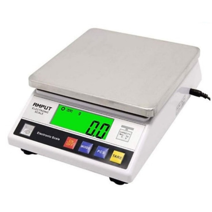 ترازوی 5 کیلویی قطعه شمار آمپوت تا 5000 گرم مواد آزمایشگاهی یا کالا را با دقت 0.1 گرم وزن میکند و نتیجه را در نمایشگر LCD خود که با نور پسزمینه سبزرنگ روشن شده، نشان میدهد. دقت خوب انواع ترازوی گرمی آمپوت در کنار قابلیت قطعه شمار آن ترازو را تبدیل به ترازویی کرده که بتوان با بهره گرفتن از آن در کارگاهها به بستهبندی مواد مختلف پرداخت. از دیگر توانائیهای ترازوی دو صفر آمپوت پارسنگ است. قابلیت پارسنگ به ترازو امکان محاسبه وزن خالص کالا را میدهد. تغییر واحد وزنی از گرم به واحدهای وزنی دیگری که قابل استفاده در صنعت و تجارت است، یکی دیگر از کارکردهای ترازو قطعه شمار آمپوت به شمار میرود. برای تراز شدن و قرار گرفتن بدون لغزش، و درنتیجه نشان دادن وزن درست ترازو هم حباب تراز برای آن در نظر گرفته شده که با تنظیم پایههای ترازوی گرمی آمپوت امکان دقیق نشان دادن وزن را برای آن مهیا میکند. برق شهری، انرژی مورد نیاز انواع ترازوی آمپوت را تامین میکند و چهار باتری قلمی هم میتواند در نبودن برق، کارکرد ترازو را تضمین کند.
